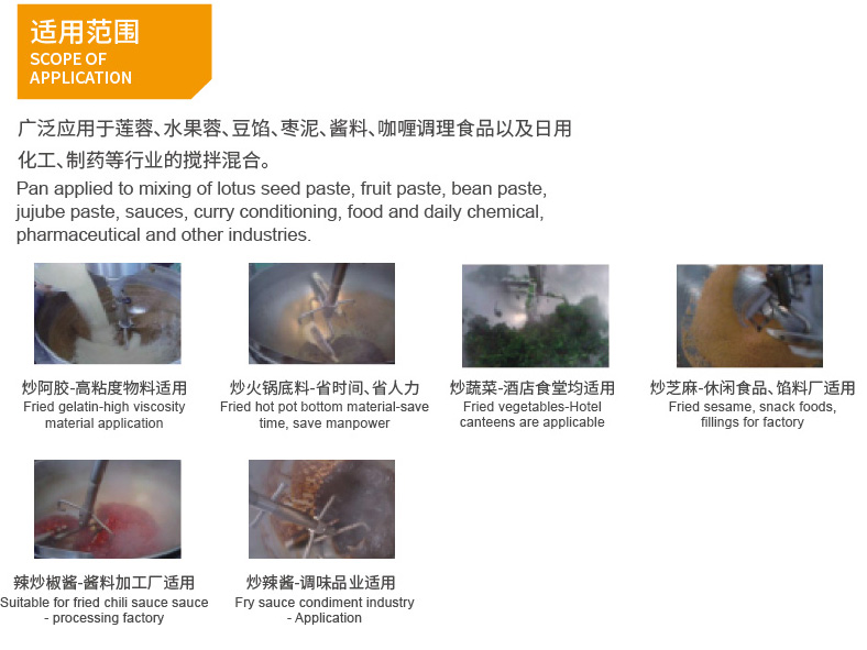 本产品锅体为一次冲压成型的半球不锈钢锅体,采用电加热、蒸汽加热、燃气加热,搅拌方式采用特殊的倾斜传动,使用的行星搅拌器与锅体充分接触,实现传动公转与自转的不整数传动比,使锅内无搅拌死角。使用先进的传动与密封结构,使传动部分与锅内洁净、卫生。采用变频调速动力,运行更平稳。电磁加热形式打破了明火烹调方式,具有升温快、无明火、无烟尘、无有害气体,对周围环境不产生热辐射,安全性好和外观美观等特点,是性能优良的食品加工设备。